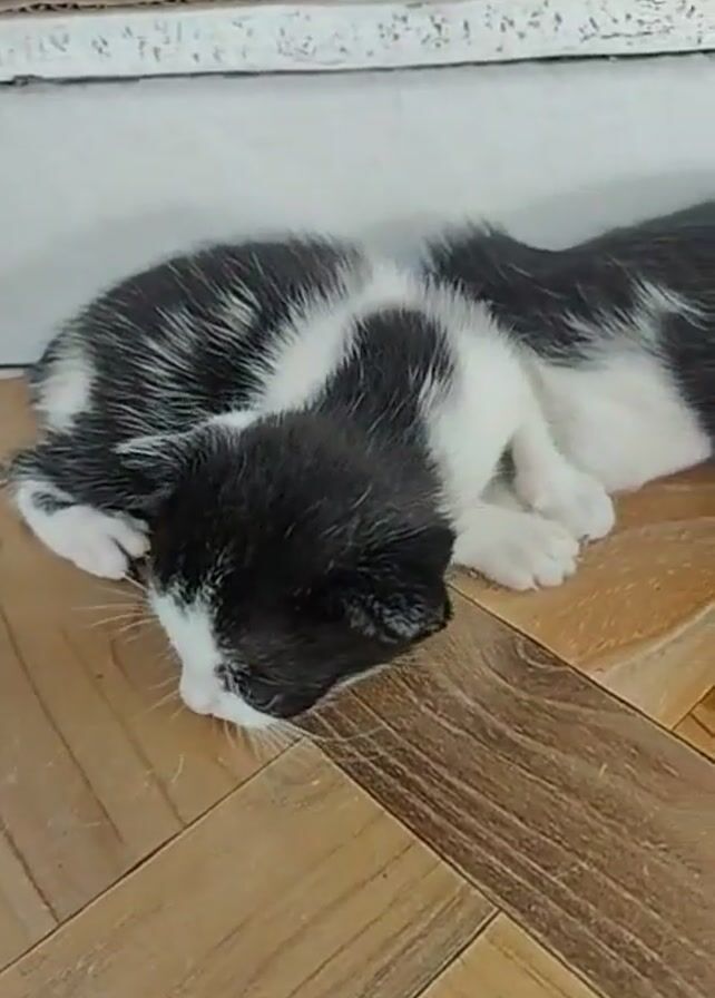 Two black and white kittens are lying asleep on a tiled floor. They are positioned near a white ledge under some discarded items, including a red and brown shoe labeled "MAGISTA." One kitten is fully stretched out, while the other is curled up. A soft meowing sound can be heard.