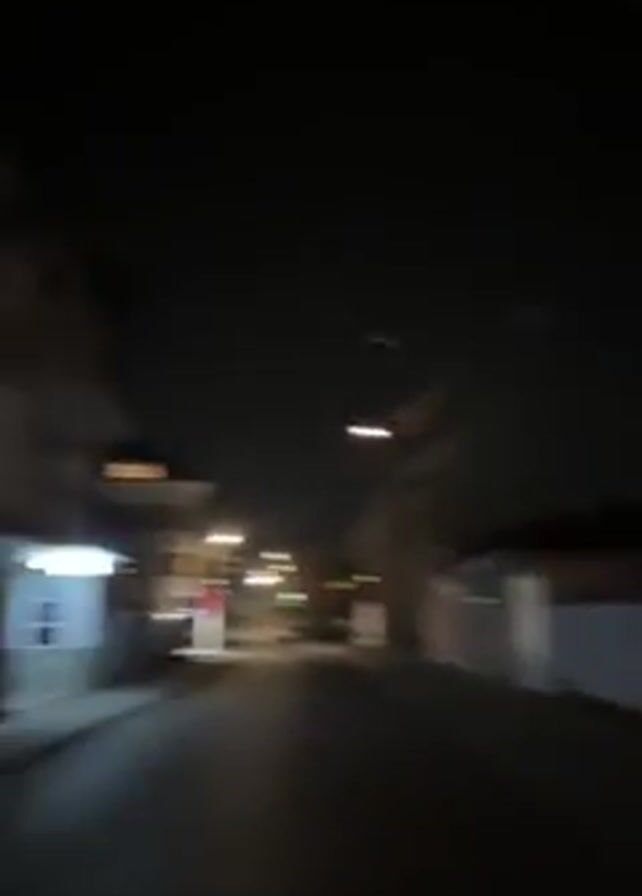 The video depicts a night scene on a dark street. A building is visible on the left side of the street, illuminated by streetlights. The street itself is mostly empty and dark. There is the sound of a whistle in the background.
