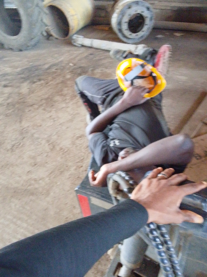 The scene is an industrial or workshop environment located in Hoche, Nigeria, characterized by a light brown, earthy ground. A person is lying prone on a dark piece of machinery or equipment, oriented diagonally from the lower center to the upper right. This individual wears a dark shirt, dark pants, and sneakers. A yellow hard hat covers their face, and their arms are bent with one hand resting on the hard hat. In the immediate foreground, a dark-skinned hand, wearing a silver ring on the fourth finger, grips a black, textured metallic object. The background displays various industrial components, including a large rubber tire, a yellow cylindrical drum, a metallic circular object, and a long cylindrical shaft lying on the ground.