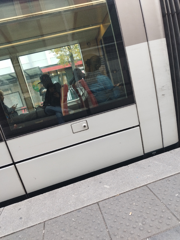 This image depicts a partial, low-angle view of a modern tram stopped at a platform in Strasbourg, France. The foreground consists of a grey concrete platform featuring tactile paving with raised circular dots, on which a single cigarette butt is present. The lower section of the tram, painted white with a narrow black base, occupies the mid-ground; a rectangular white panel containing a central, silver-colored door release mechanism is visible. Through the tram's large, reflective windows, several seated passengers are visible. On the left, a person with lighter hair is partially visible, holding a smartphone. Centered, a person wearing a dark hooded top and a dark baseball cap is looking down at a smartphone, with the device's light illuminating their face. To the right and slightly behind, a third individual is seen from the back, wearing a blue denim jacket, with their hair gathered at the nape of the neck. Red-backed seating is visible within the tram's interior. The tram windows also display reflections of the exterior environment, including a tree with green and yellow autumn leaves, a building featuring a red awning or signage, and indistinct street-level structures. The scene is illuminated by daylight.