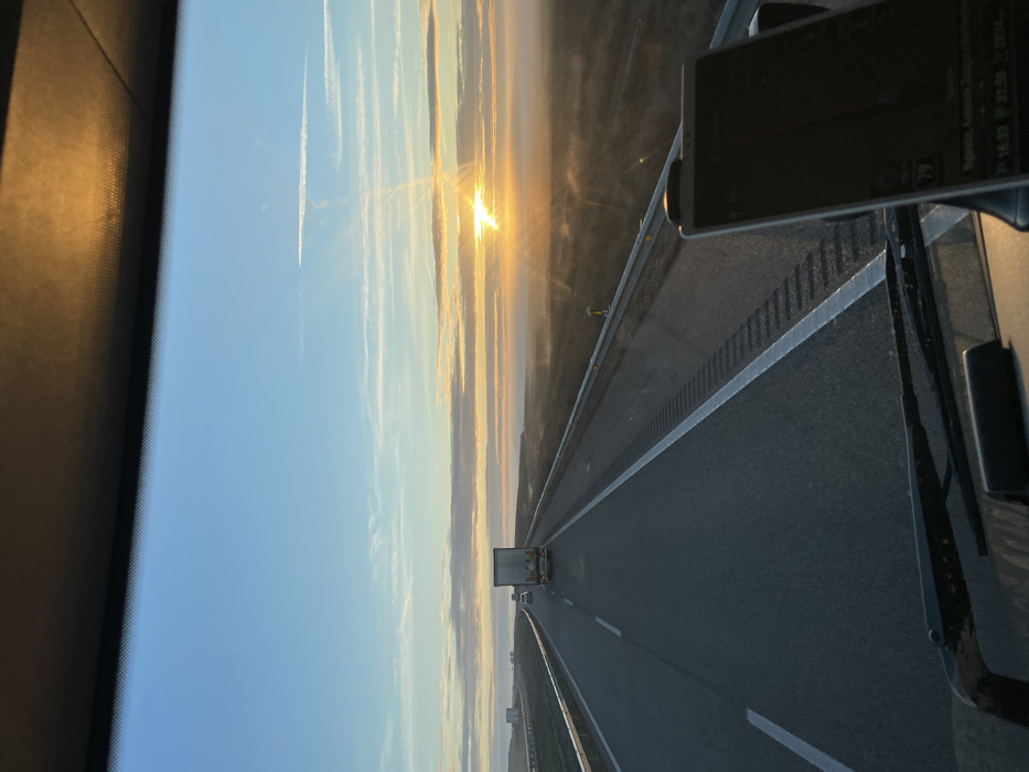 A highway stretches towards a golden sunrise, visible through the windshield. White contrails streak the blue sky above. A large truck moves in the distance on the same lane. The road surface is dark and marked with white lane dividers. A navigation device is attached to the dashboard, displaying time data. The scene captures a journey during the early hours, with the sun illuminating the road and sky.