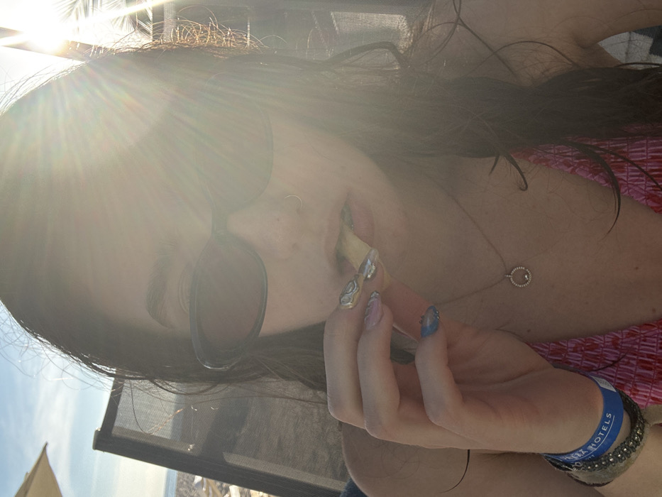 A person wearing sunglasses is eating something fried, possibly a French fry. Their nails are decorated in a unique pattern with shiny embellishments. They wear a necklace with a circular pendant and multiple bracelets, including a blue wristband with text. The sun is shining brightly. They are at an outdoor location.