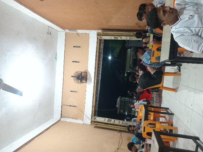 A group of people sits at tables in an indoor space, likely a restaurant. The interior has a tan ceiling and walls, with a ceiling fan visible. An open doorway reveals an outdoor scene with dark sky, street lights, and a building in the distance. The chairs are bright orange plastic, and tables are dark. The individuals are casually dressed and seem to be engaged in conversation or enjoying a meal.