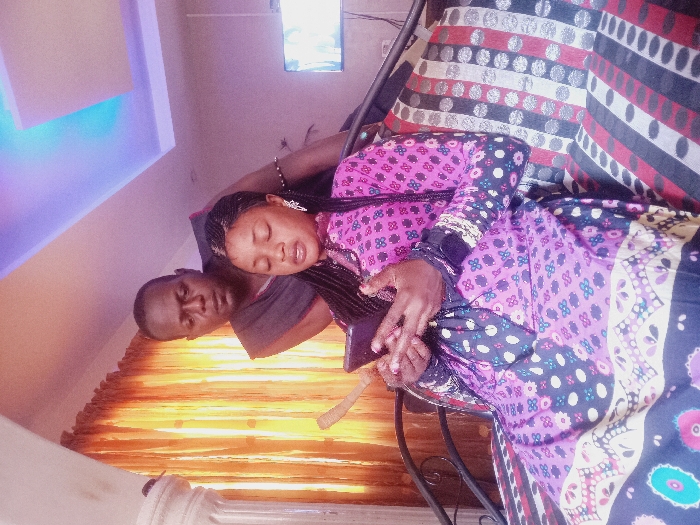 Inside a residence in Sabon Tasha, Nigeria, a young adult woman is seated on a patterned cushion, holding a dark-colored smartphone with both hands and looking down at its screen. She is wearing a long-sleeved dress or robe with intricate patterns in purple, pink, black, and white, adorned with rings on her fingers and large dangling earrings. Behind her, an adult male stands, observing her with a neutral expression, dressed in a dark, possibly sleeveless garment. The immediate background features light brown curtains and a white fluted pillar on the left. The upper right portion of the scene displays a modern ceiling with recessed lighting emitting a purple hue, and a partially visible flat-screen television mounted on a distant wall. The woman is seated on furniture featuring a black metal frame and a cushion with red, black, white, and grey striped and circular patterns.