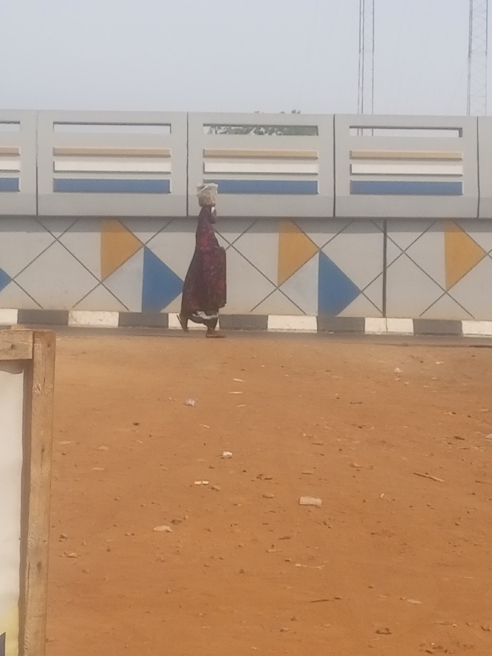 A woman walks along a road carrying a bundle on her head. She wears a long, patterned dress and sandals. Behind her is a concrete barrier with geometric blue and yellow designs. A black and white curb runs along the bottom of the barrier. The road is dirt and scattered with litter. A wooden sign is partially visible on the left side of the image. Overhead power lines are faintly visible in the background sky.