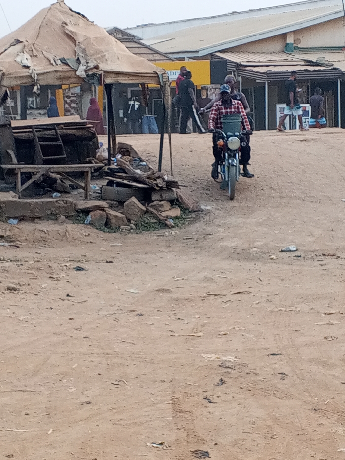 A dirt road scene. A man rides a motorcycle with a passenger towards the viewer. The background features cluttered roadside infrastructure: a makeshift shelter with debris and what appears to be a bench, plus storefronts with people nearby. The overall setting suggests a bustling, somewhat disorganized, outdoor market or commercial area. The ground is uneven and covered in loose dirt.