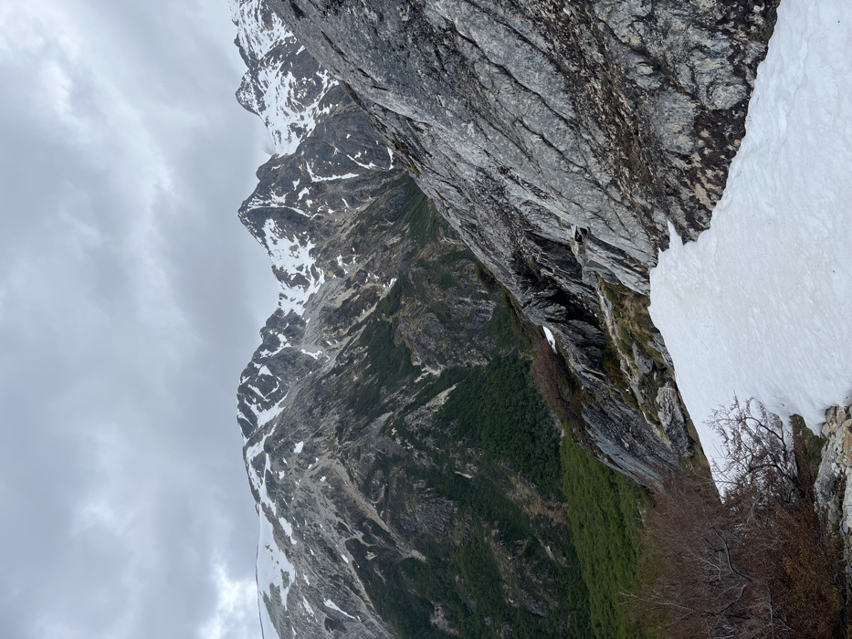 A steep, rocky mountain slope dominates the frame, contrasted against a cloudy sky. Patches of snow cling to the higher elevations, interspersed with areas of exposed rock and sparse green vegetation. The lower foreground reveals a rock face with a snow drift and a small, barren shrub. The overall scene depicts a harsh, alpine environment.
