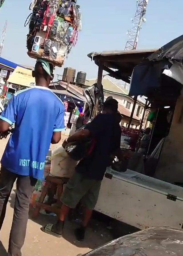 bustling street scene in what appears to be a marketplace. Several people are visible, including two men carrying large stacks of goods on their heads and shoulders. The first man has a stack of packaged phone cases and headphones, while the second man carries a stack of headphone boxes. A third man, wearing a Spotify t-shirt, walks by holding a small, green box. Another man in an "off-white" basketball jersey is also seen standing in the crowd. The environment includes stalls, vehicles, and a communication tower in the background. The overall atmosphere suggests a busy commercial area.