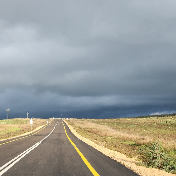 A two-lane asphalt road, marked with a double solid white center line and solid white and yellow shoulder lines, extends into the distance under a sky dominated by dark grey, heavy storm clouds. The road shoulders consist of light brown gravel. Flanking the road are undulating fields covered with a mix of green grass and sparse, dry, light brown vegetation. On the left side, several white utility poles and two white, rectangular road signs are visible in the mid-ground. The right side includes a low, indistinct fence line and a small green bush in the foreground. No individuals or vehicles are present. The scene is located in the Golan Regional Council, Israel.