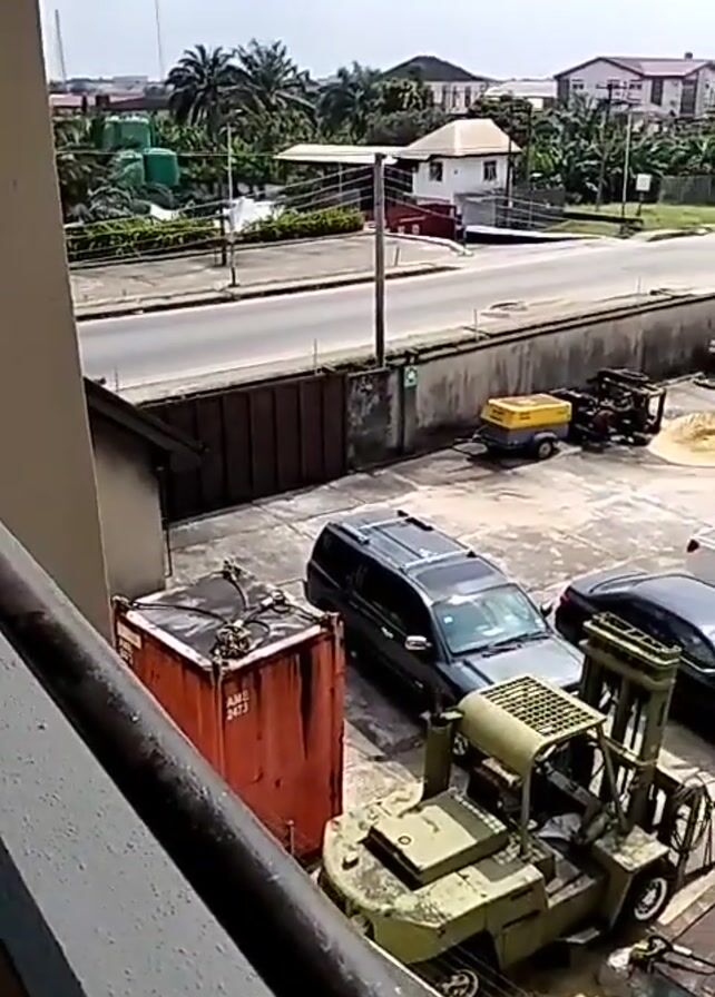 view from an elevated position, possibly a balcony or upper floor window, overlooking an industrial or commercial area. Below, there is a parking area with several vehicles, including a black SUV, a black car, and a white pickup truck. A forklift is parked nearby. There are also several shipping containers, some stacked on top of each other, and a yellow portable generator. In the background, there is a road with sparse traffic, lined with buildings and greenery. One building has solar panels on its roof. The sky is overcast. The overall impression is of a mixed-use area with industrial and residential elements.