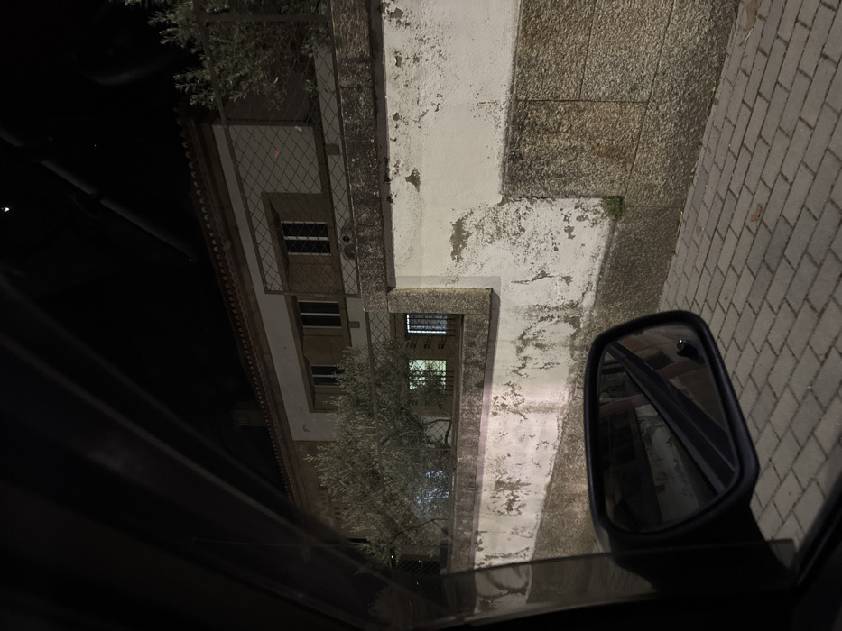This nighttime image, captured in Mirandela, Portugal, depicts a view from the interior of a vehicle looking out the front passenger-side window. The dark frame of the vehicle's door and a portion of the side mirror occupy the lower left of the composition. The side mirror reflects an indistinct, dark view of the vehicle's side. A paved sidewalk constructed from interlocking grey rectangular pavers is visible in the lower right quadrant. Adjacent to the sidewalk, a multi-layered wall system is present. The base consists of dark, weathered granite blocks. Above this is a white-painted stucco wall exhibiting significant peeling, discoloration, and stains, revealing darker material beneath. Perched atop this wall section is a concrete or stone railing, behind which several small, leafy trees, likely olive trees, are situated. Behind the wall and trees, a two-story residential building with a reddish-brown tiled roof is visible. The upper floor of the building features a light-colored facade, with at least three rectangular windows equipped with dark shutters and decorative metal security grilles. A larger, diamond-patterned metal mesh grille covers a portion of the upper facade. On the building's lower level, two windows are discernible through the foliage and railing, displaying interior illumination. The sky above is dark and cloudless, indicative of nighttime conditions. No individuals or active interactions are visible in the scene.