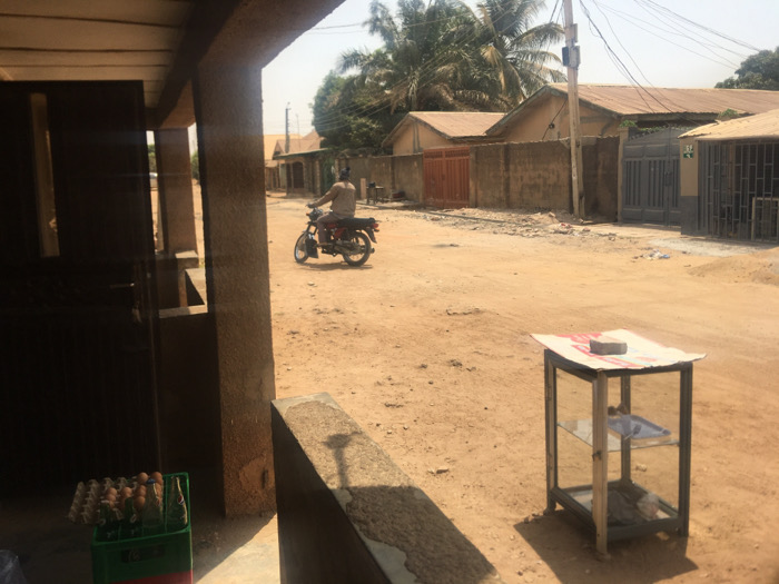 This image depicts a daytime scene on an unpaved street in Sabon Tasha, Nigeria