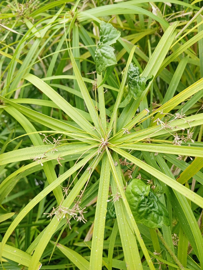 A vibrant green plant with long, slender, sword-like leaves radiating from a central point. Some leaves display yellow variegation. Small, intricate seed heads emerge amidst the foliage. Distorted, textured green leaves from a different plant species are intertwined within the primary plant, creating an interesting visual contrast. The close-up shot focuses on the plant's structure and the textures of its leaves.