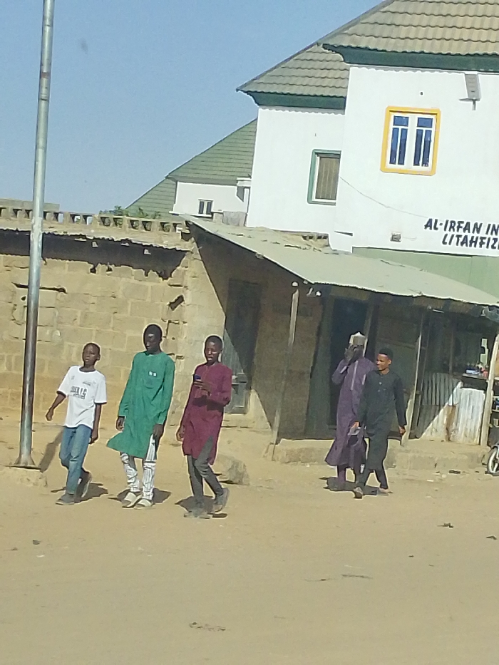 The image displays a daytime street scene in Mariri, Nigeria. Five males are positioned on a light-colored dirt road. From left to right, a young male in a white t-shirt and blue jeans walks left. Beside him, a young male in a green tunic and striped pants walks left. Adjacent to him, a young male in a maroon tunic and dark pants walks left while observing a smartphone held in his right hand. Behind this group, an older male in a purple tunic and a light-colored cap walks right, with his right hand raised near his face. Alongside him, a young male in a dark tunic walks right. In the background on the left, a low, rough-hewn stone wall is visible. To the right of the wall, a single-story structure with a slanted corrugated metal roof is present. Behind these, a two-story white building with a green tiled roof features a prominent yellow-framed window with blue vertical bars. Text reading "AL-IRFAN IN LITAHFIZ" is visible on its facade, and a solar panel is mounted on its roof. Another building with a green roof is partially visible beyond it. A tall, thin metal pole stands vertically on the far left. The sky is clear, and strong sunlight casts distinct shadows.