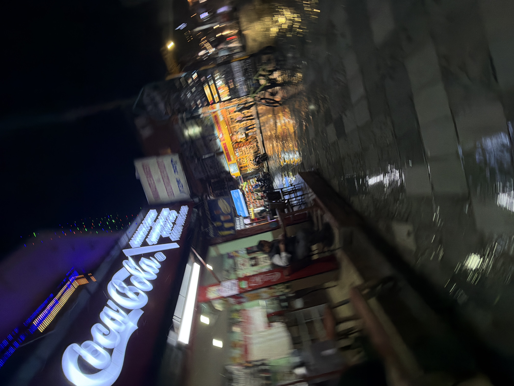 This nighttime photo, taken with apparent motion blur, appears to be of a street scene in Pokhara, Nepal. A large, illuminated Coca-Cola sign is visible on the left. Buildings with glowing storefronts line the street, their lights reflecting off a wet surface, possibly a rain-slicked street or sidewalk. People are discernible, though blurred, within and around the storefronts.