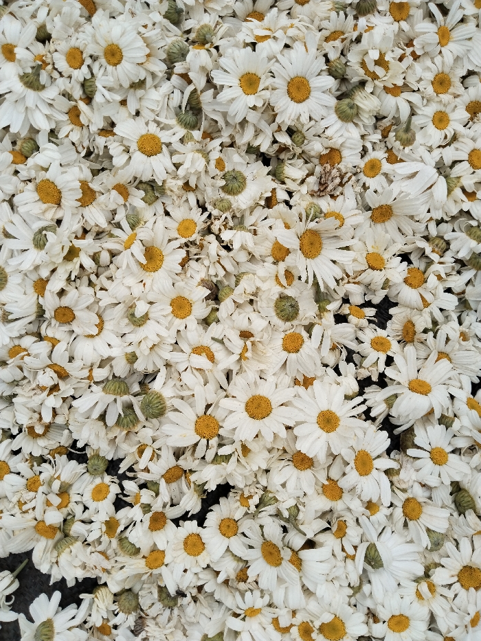 This forensic description pertains to an image taken in Unknown, Kenya. The scene presents a dense, top-down view of a large, uniform accumulation of harvested white-petaled flowers, consistent with Pyrethrum daisies (Chrysanthemum cinerariifolium). Each flower features a prominent yellow or greenish-yellow central disc surrounded by white ray florets. The flowers exhibit varying stages of freshness, with some petals appearing slightly wilted or exhibiting minor brown discoloration. Numerous unopened green flower buds are interspersed throughout the dense aggregation. The mass of flowers entirely fills the photographic frame, obscuring any underlying surface or background. No human figures, objects other than the flowers, or discernible actions are present.