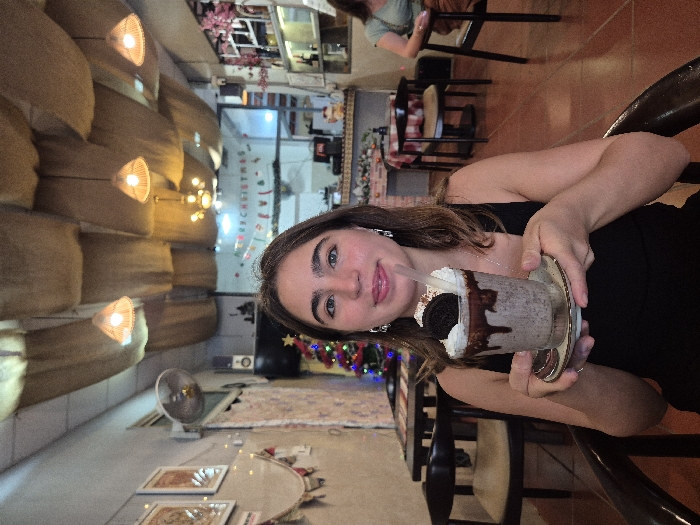 A young woman poses indoors, holding a decorated milkshake topped with whipped cream and an Oreo cookie. She wears a black top. In the background, soft lighting comes from unique hanging fixtures. A Christmas tree is faintly visible, suggesting a festive atmosphere. The scene appears to be in a cafe or restaurant, with tables and chairs visible.