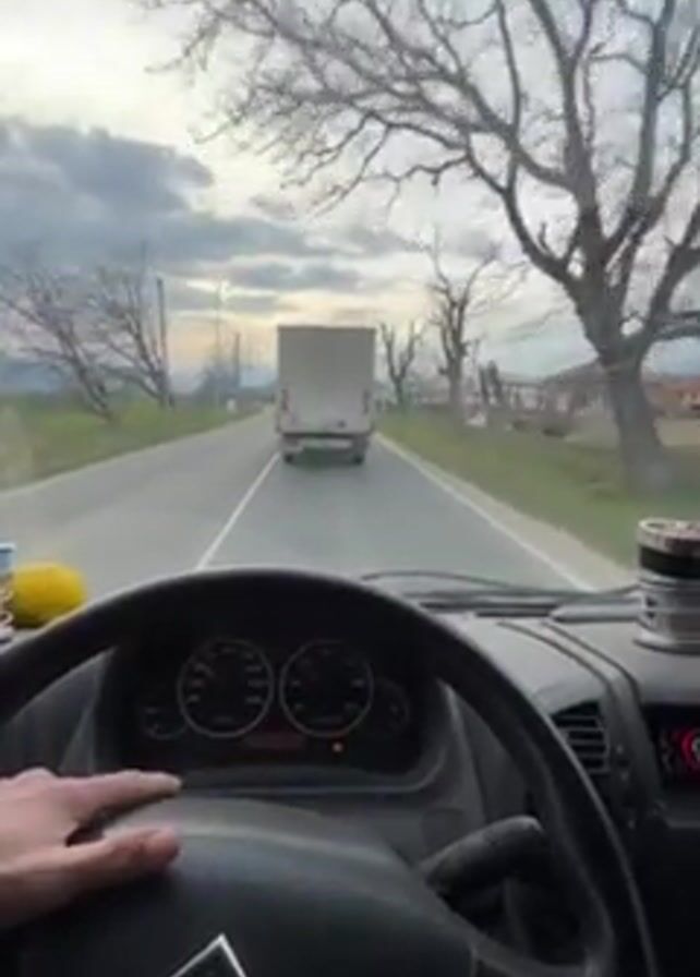 The view from inside the cab of a Citroen vehicle shows it following a white truck on a two-lane road