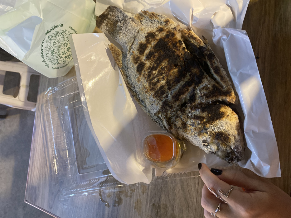 A high-angle view depicts a whole, salt-crusted grilled fish, exhibiting significant charring, presented on white paper wrapping within a clear plastic take-out container. A small, clear plastic cup containing an orange-red dipping sauce is positioned adjacent to the fish. In the lower-left, a female hand with dark nail polish and two silver rings is visible, reaching towards the food. The background includes a light green plastic shopping bag featuring Thai script and an eco-friendly graphic, along with a light-colored plastic stool. All items rest on a wooden or laminate table surface under artificial lighting. The presence of Thai script on the bag confirms the scene is located in Pattaya City, Thailand.