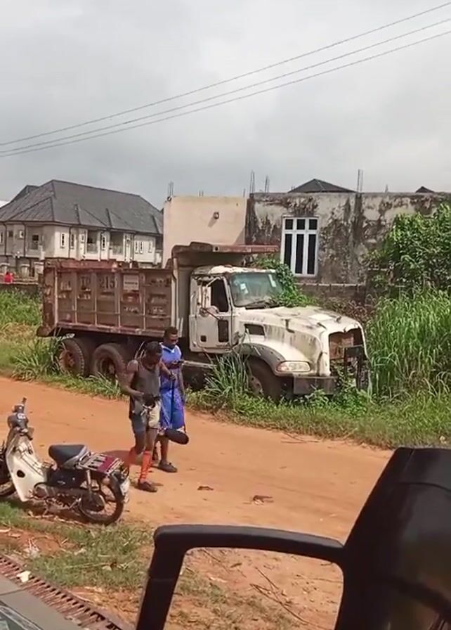 two men walking on a dirt road past a dilapidated truck. The truck is white and appears to be a dump truck with a rusty bed. One man is wearing a blue athletic jersey and shorts. The other man is wearing a grey tank top and short shorts. He is carrying a pair of shoes and a black purse. A motorcycle is parked nearby. Buildings and tall grass are visible in the background. The sky is overcast. The video is taken from inside a building, with a table and chair partially visible in the foreground.