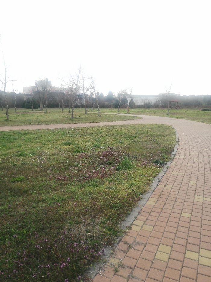 The image depicts a park or green space in Galabovo, Bulgaria, under an overcast sky. In the foreground, a curved pedestrian pathway composed of reddish-brown and lighter rectangular paving stones runs from the lower right towards the center-left. A narrow concrete curb separates the path from a grassy area to its left. This grassy area contains mixed vegetation, including patches of green grass interspersed with areas of purplish-pink flowering ground cover and scattered white dandelion seed heads. The midground features an expansive, unpopulated grassy field dotted with numerous deciduous trees, most appearing bare of leaves, suggesting a dormant season. A narrower, unpaved dirt path curves through this grassy expanse further back. Towards the right midground, a small, open-sided wooden structure with a peaked roof, resembling a gazebo or picnic shelter, is visible, containing a single wooden bench. A yellow cylindrical object, possibly a bollard or utility post, stands near a tree in the left midground. In the background, a dense line of darker trees or tall shrubs forms a boundary. Beyond this natural barrier, industrial or large commercial buildings are visible, including a long, light-colored structure with a flat roof. Further to the left background, several multi-story buildings, consistent with residential apartment blocks, are discernible against a bright, hazy sky. No individuals are present in the scene, and no overt actions or interactions are depicted.