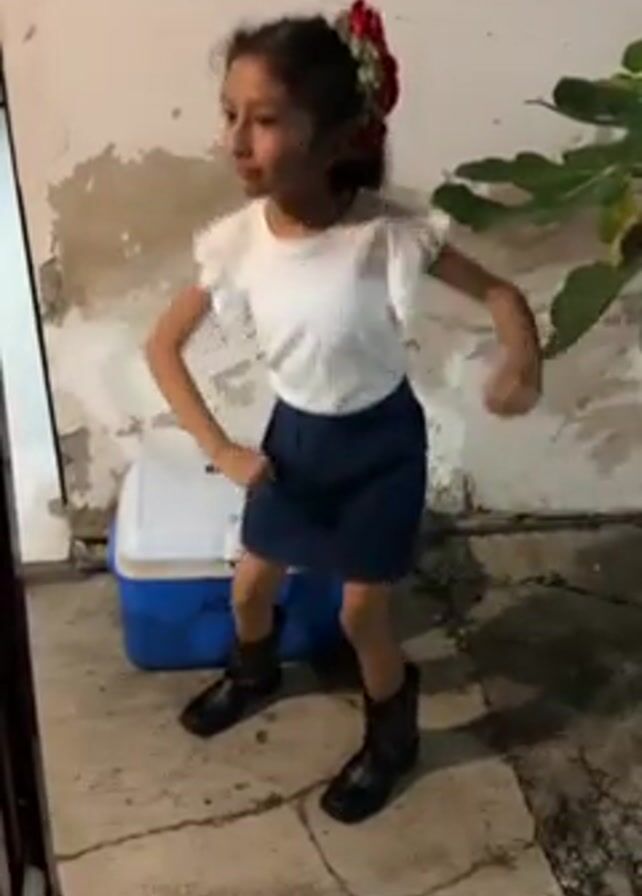 girl dressed in a white short-sleeved shirt, a dark blue skirt, and black boots, standing outside in a cracked cement area. She has dark hair pulled back with red flowers in her hair. She's moving her arms and body in a dance-like manner and then walks toward the camera. Behind her is a white wall with peeling paint, a blue and white cooler, and a green leafy plant. A dark wooden object is on the left side of the frame, obscuring the view slightly.