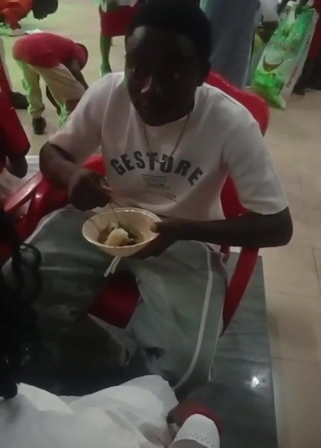 A person wearing a white t-shirt with the word "GESTURE" printed on it is sitting in a red plastic chair, eating from a bowl with a spoon. They are also wearing gray sweatpants with white stripes and a gold chain. Another person is sitting in front of them, wearing white clothing. There are several children in the background, some wearing red shirts and khaki pants, and one wearing a white shirt and red shorts. A green bag with the word "Optimum" on it is visible on the right. The floor appears to be tiled and the setting appears to be a room filled with various objects and people.