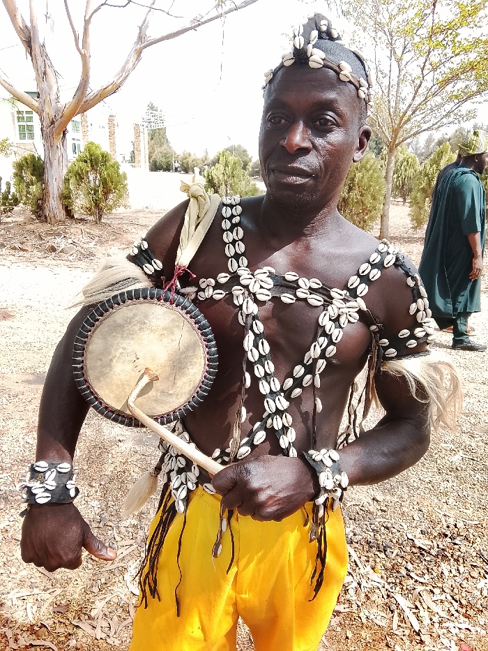 The image captures an outdoor scene in the city of Nabatum, Nigeria, under clear, bright daylight. A dark-skinned adult male is centered in the foreground, facing the viewer directly with a neutral expression. He is bare-chested and wears bright yellow trousers. His head is adorned with a pattern of cowrie shells integrated into his short hair, forming a band around his hairline and a small tuft on top. His torso is covered by an elaborate costume of multiple cowrie shell strands strung on dark material, creating a crisscross design across his chest and shoulders. Thick bands of dark material with cowrie shells and protruding light-colored fibrous tufts are on both upper arms, and similar bands encircle his wrists. A light-colored fabric sash is draped over his left shoulder. He holds a circular hand drum with a light-colored skin head and a dark, stitched rim in his left hand, and a curved wooden drumstick in his right hand, positioned as if ready to strike the drum. To the right of the main subject, slightly in the background, a second adult male is partially visible, wearing a long, dark green robe and a matching cap. The ground beneath them is dry, light brown earth with scattered debris. The background features sparse vegetation, including a large, light-barked tree with minimal foliage on the left, and several smaller green shrubs. In the far distance, a light-colored building with windows is visible on the left, and a prominent archway or gate structure flanked by pillars is discernible further back, against a bright sky.