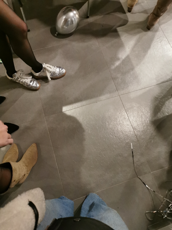 A gray tiled floor hosts a collection of footwear: silver sneakers with white laces on a person wearing black tights, tan suede boots on a seated individual wearing blue jeans and a cream-colored sherpa jacket, and brown boots near a balloon. A piece of metallic streamer lies on the floor. The scene appears to be a gathering or event with diverse fashion choices.