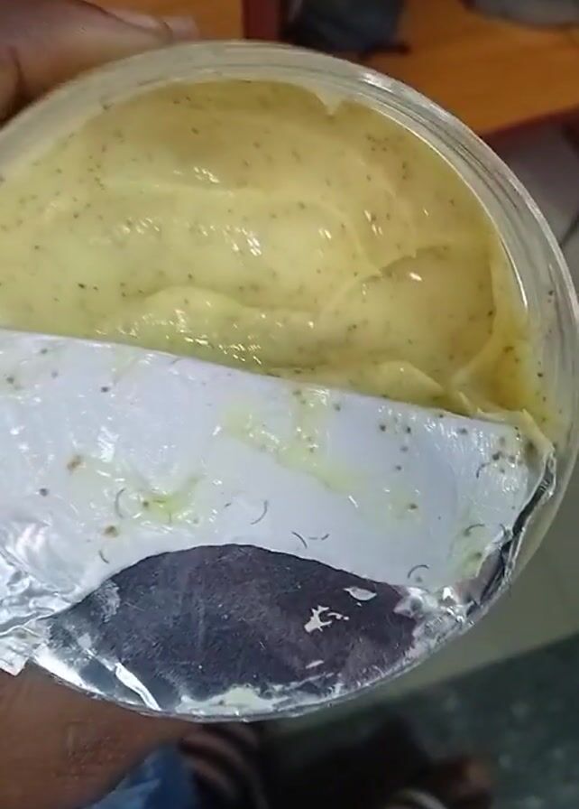 A hand is holding a clear plastic container, partly opened. A silvery foil seal, torn in half, covers the bottom of the container. A yellow cream with dark specks sits on top of the seal. Several short, dark, straight hairs are visible on the foil. The background includes a partially visible wooden surface and a blue garment.