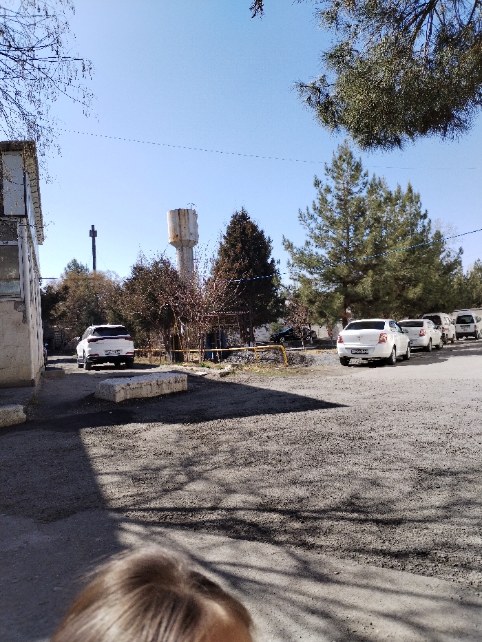 The image depicts an unpaved outdoor area in Yangiariq, Uzbekistan, under a clear blue sky. The top of a human head, featuring light-colored hair, is visible at the bottom of the frame. The ground is a gravelly, uneven surface with pronounced shadows from overhead trees. Two rectangular concrete blocks are present on the ground in the left foreground. To the left, a portion of a light-colored building wall with visible wear is partially visible. A white SUV, bearing Uzbekistan license plate 06 Z 929 YA, is parked facing away from the viewer in the mid-left. A tall, weathered concrete water tower with a damaged top dominates the background, positioned left of center. To its left, a dark, slender utility pole stands against the sky. To the right of the water tower, a line of several white vehicles, including a sedan with license plate 06 S 633 JA and multiple vans, are parked sequentially on the unpaved ground. Various trees, including leafless deciduous types and several tall evergreen pines, are distributed across the midground and background. Yellow barriers or pipes are visible near the ground in the central midground.