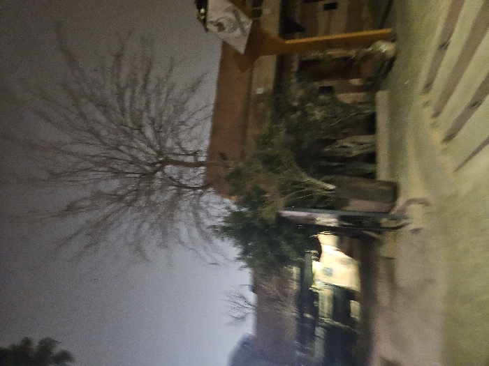 A nighttime scene features a bare tree with intricate branching against a grey sky. The tree is positioned near a building, with some greenery partially obscuring the facade. A structure of wood and metal, possibly scaffolding, is visible near the building. The foreground is illuminated by a light source, casting a bright glow on a paved surface, suggesting a sidewalk or street. The composition is slightly tilted.