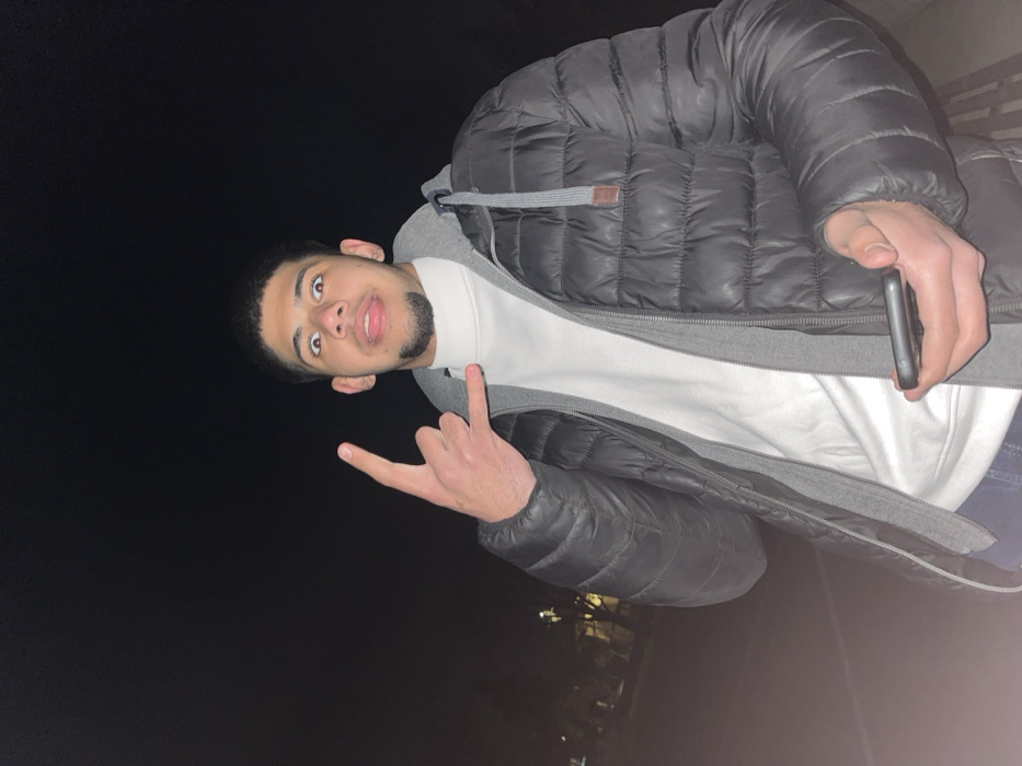 An image captured at night in Dolni Chiflik, Bulgaria, displays a single male subject positioned centrally, facing the camera. The male exhibits a light beard, dark hair, and a playful facial expression with widened eyes, raised eyebrows, and his tongue slightly protruding. He is dressed in a white turtleneck shirt, a grey hooded sweatshirt, and a dark grey or black puffer jacket with horizontal stitching. The jacket features a small brown square patch on the upper left chest area. Blue jeans are visible at the bottom of the frame. The subject's left hand is raised, forming the "rock and roll" gesture with extended index and pinky fingers. His right hand holds a dark-colored smartphone horizontally at waist height. The background is dark, indicating a nighttime setting, with blurred, distant artificial lights visible on the left side. The ground beneath the subject appears to be a paved surface, with a faint grid pattern visible on the far right.