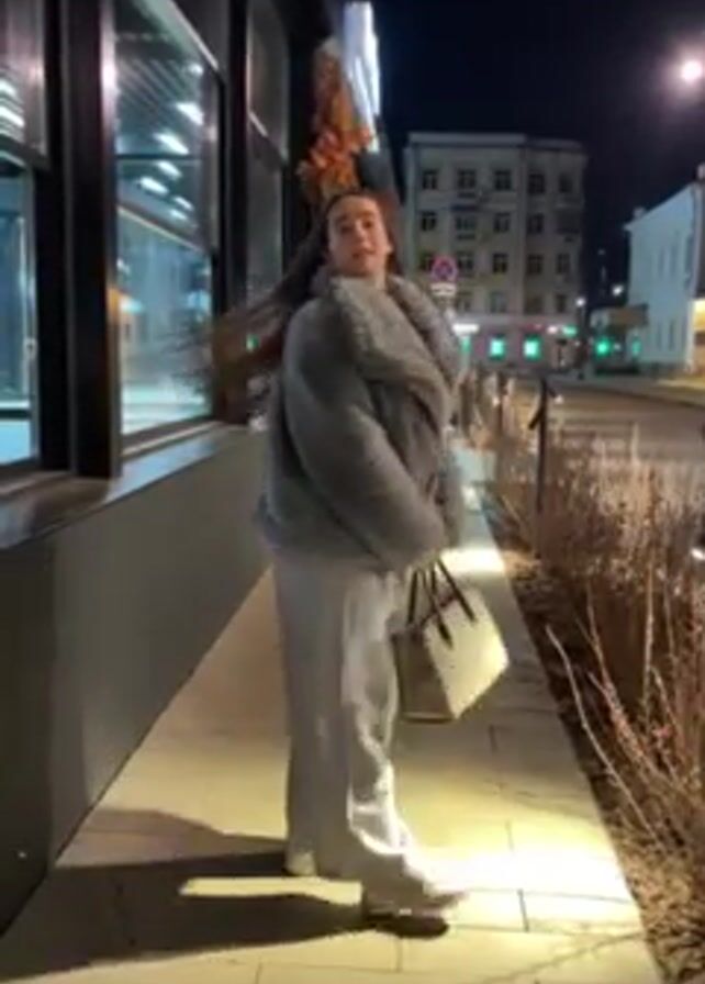 A young woman walks toward the camera on a paved sidewalk at night. She is initially wearing a light gray hoodie and white pants, and then dramatically throws on a large gray faux fur coat. She carries a brown bag. The setting is an urban street, with a building on one side and other buildings across the street. Streetlights provide illumination. The sidewalk is paved with square tiles.