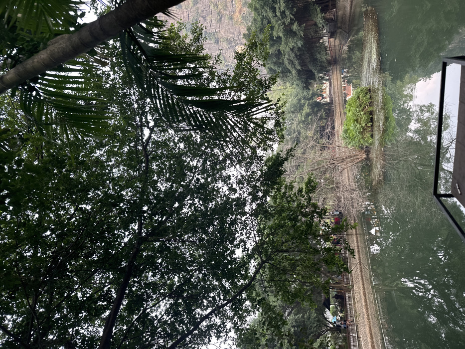 This image presents a natural landscape scene within Hoa Lư Ward, Vietnam. The upper portion of the frame is heavily obscured by a dense canopy of dark green tree leaves and palm fronds, allowing glimpses of an overcast sky. In the lower foreground, a dark, low-profile railing or edge of a platform is visible at the bottom right. The midground features a calm body of dark green water, likely a pond or canal, exhibiting reflections of the overhead foliage and sky. A small, circular island of vibrant green ferns is centrally located within the water. The far bank of this water body is lined with a paved walkway, where several indistinct human figures are visible, standing or moving. Beyond the walkway, a mix of trees with varying foliage density, including some with bare branches and others with full green leaves, extends further into the midground. The background reveals a prominent, rugged karst mountain formation rising on the right, with additional dense foliage lower down. The lighting indicates an overcast day.