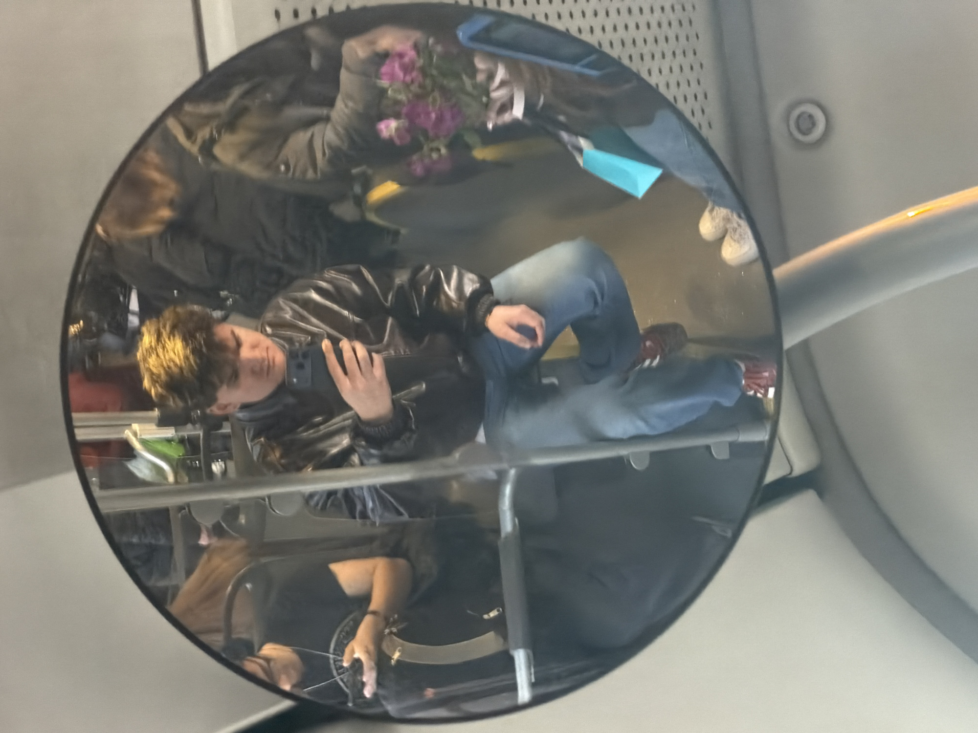 A circular mirror reflects the interior of a public transport vehicle in Sofia, Bulgaria. The central subject is a young male with light brown hair, wearing a dark bomber jacket, blue jeans, and red and white sneakers, holding a dark smartphone in his left hand and looking downwards. To his left, partially visible, another individual with dark hair wears a black t-shirt with a white graphic and a silver necklace, holding a dark phone. To his right, a third person in a dark jacket holds a bouquet of purple flowers wrapped in light paper and has a small blue shopping bag at their feet, which are clad in light-colored sneakers. The vehicle's interior features gray walls, metal poles, and hints of yellow seating upholstery, with a perforated panel visible on the ceiling. All individuals appear to be passengers, engaged with personal devices or possessions, with no direct interaction observed.