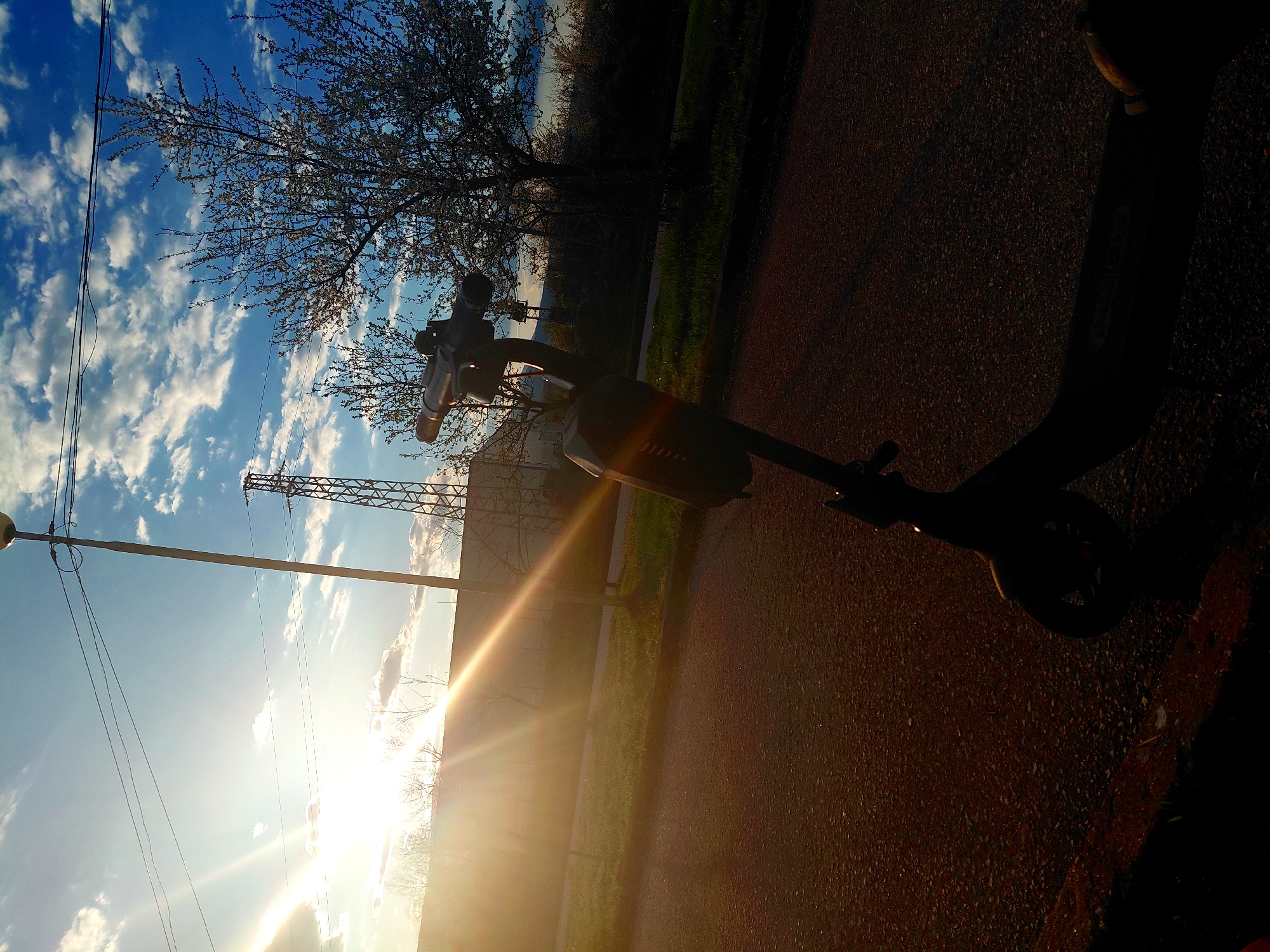 The image, likely taken at ground level, is oriented sideways. The sky is visible in the background, exhibiting a blue hue with scattered white clouds. A tree with bare branches is also present, with power lines strung overhead. A structure, possibly a building, stands in the mid-ground. In the foreground is the silhouette of a scooter, positioned on what appears to be a paved surface, possibly a road or pathway. The lighting is dramatic, with a bright sunlight shining through, casting strong shadows and creating a lens flare effect. The location is unspecified, and there are no people visible in the frame. The scene is static, without any evident action.