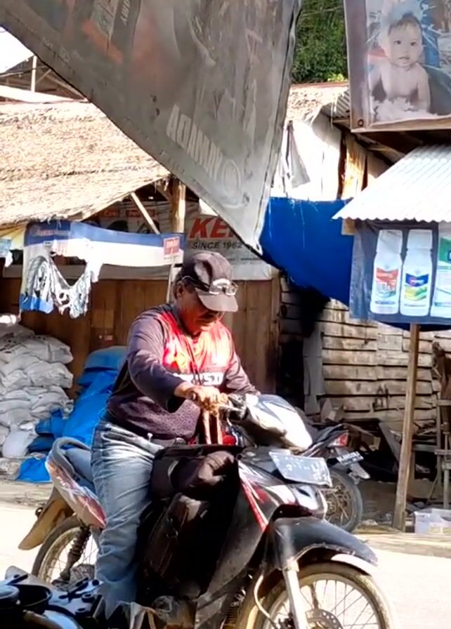 Here's a concise description of the scene: A man wearing a black cap, sunglasses, a black and red long-sleeved shirt, and jeans is sitting on a black motorcycle parked on a paved street. He's fiddling with something on the handlebars. In the background, there's a mix of corrugated metal and thatched roof structures, advertising banners, and a pile of blue tarps. A child walks by.