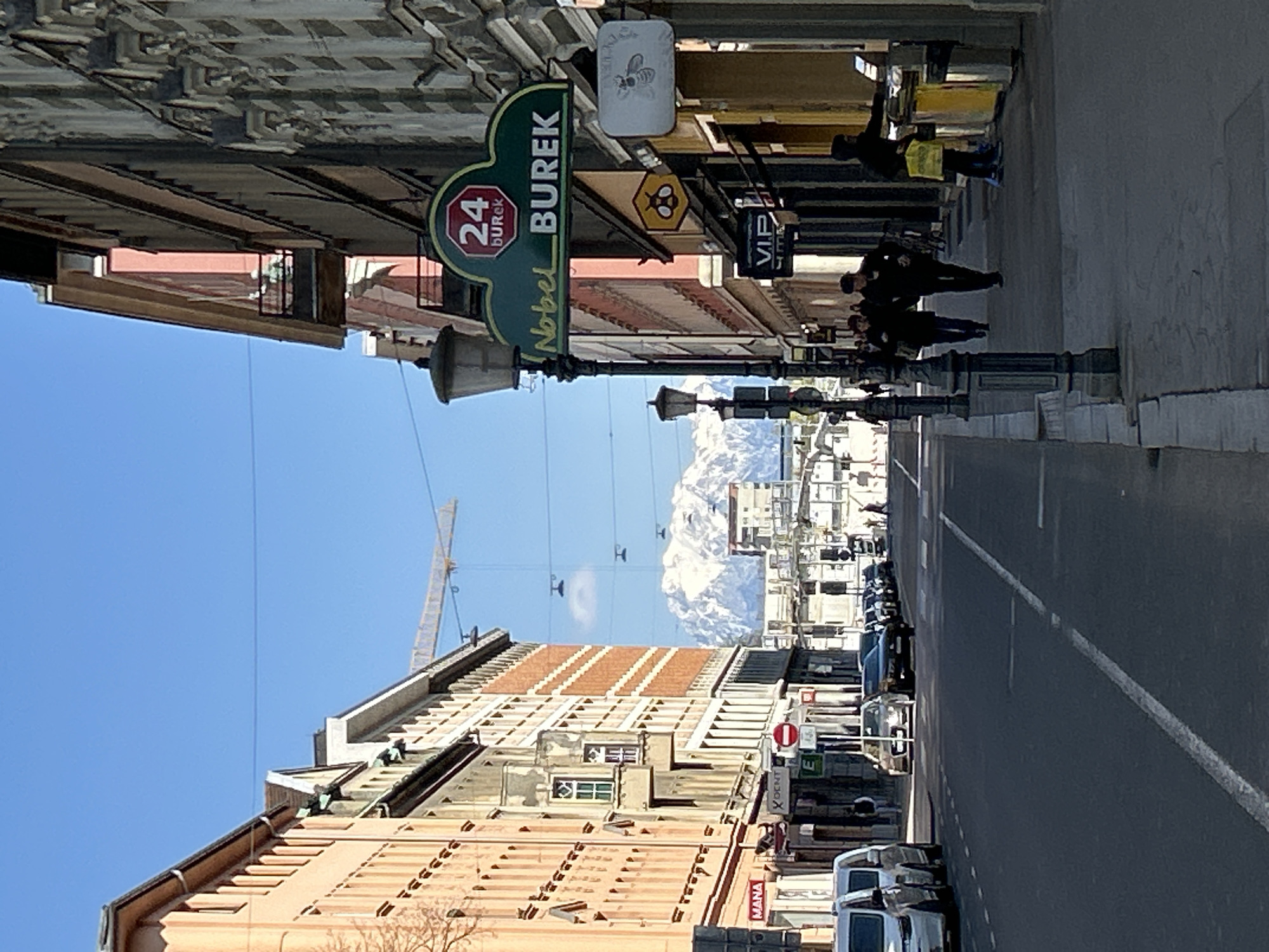 The image presents a daytime street scene looking north along Dunajska cesta in Ljubljana, Slovenia. The background is dominated by a range of snow-capped mountains, likely the Kamnik-Savinja Alps, beneath a clear blue sky. A yellow construction crane boom extends horizontally across the upper mid-ground. In the foreground on the right, a dark grey sidewalk features a decorative black street lamp and a prominent green oval sign advertising "Nobel BUREK" with a "24 BUREK" logo. Below this, business signs include one with a yellow bee graphic and another reading "V.I.P.". Three individuals are visible on this sidewalk: two pedestrians in dark clothing walk away from the viewer, and further right, a person in dark clothing holding a yellow bag engages with an outdoor vending unit. The left foreground shows two white vehicles parked along the curb. The mid-ground is occupied by an asphalt road with white lane markings, indicating both parking and traffic lanes. Multiple cars are parked along the left side of the street, with additional vehicles visible further down. A "No Entry" sign is present on the left sidewalk. Multi-story buildings line both sides of the street. On the left, a light orange/peach colored building displays a "MANA" sign, followed by a building with a bay window and a "X DENT" sign. On the right, buildings exhibit varied facades, including reddish-brown sections, balconies, and grey textured elements. Overhead wires and additional streetlights are visible across the urban environment.