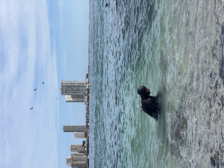 The image depicts a coastal scene in Iquique, Chile, under a clear sky with scattered clouds. In the foreground, an individual wearing a black full-body wetsuit and hood is partially submerged in shallow, clear ocean water, bending forward at the waist and looking down. The seabed beneath the individual is visible, composed of light-colored pebbles and rocks. The water gradually deepens and transitions to a darker blue-green towards the horizon. In the midground, the water features gentle ripples. A small, dark bird floats on the water's surface to the far right. Several other birds, appearing to be gulls, are in flight across the sky. The background reveals the distinctive urban skyline of Iquique. Numerous high-rise buildings, predominantly residential towers, line the distant coastline. Several boats are visible near the shore and structures. A prominent yellow cylindrical buoy is anchored in the water closer to the landmass on the right side of the background. The overall impression is a daytime scene at a populated coastal area.