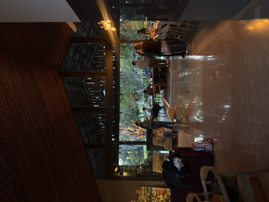 A large, dimly lit hall is filled with people. Tables are set for dining near the windows, while others stand around socializing. Outside, trees are visible through the expansive glass. The hall features wooden walls and a high, angular ceiling with hanging chandeliers. In the foreground, furniture is scattered around, suggesting a more relaxed lounging area.