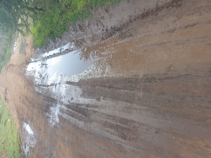 A muddy road stretches into the distance, marked by tire tracks and large puddles. The road surface is a mix of brown soil and standing water, creating a reflective surface. Green vegetation lines the left side of the road, providing a contrast to the earthy tones. The overall scene suggests a rural or unpaved pathway after a recent rainfall.