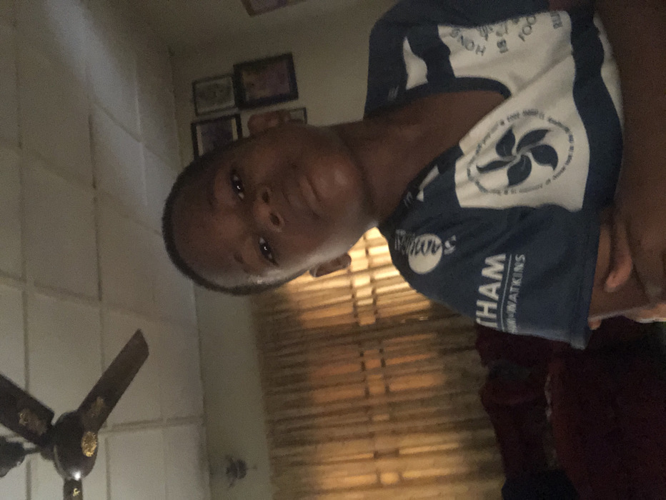 A person wears a blue and white t-shirt with lettering and a flower-like symbol. The individual's face is tilted slightly towards the camera. Behind the person, a window covered by horizontal blinds allows light to filter into the room. To the left, a ceiling fan with decorative gold accents is visible. A collection of framed pictures is displayed on the wall. The overall lighting in the scene is subdued, creating a soft ambiance.