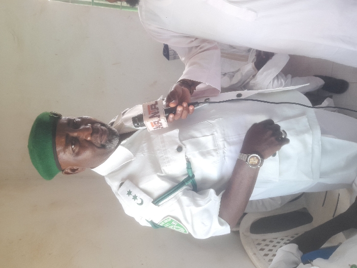 A middle-aged man wearing a green beret and white uniform is being interviewed. The uniform has decorative stars and crescent shapes on the shoulder epaulettes. He wears a wristwatch and a ring on his left hand. A microphone labeled "NNA" is held in front of him by a person wearing white clothing. The man is seated and appears to be the focus of the interview.