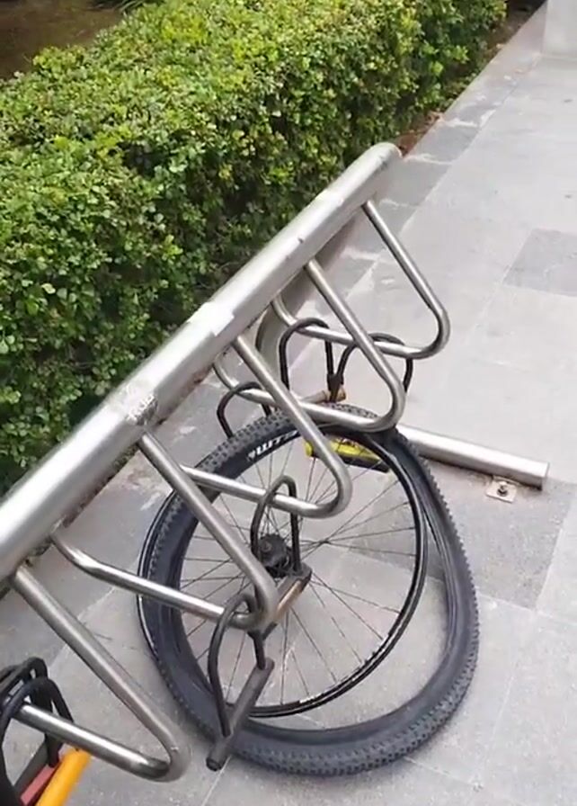 bicycle front wheel and tire locked to a stainless steel bike rack on a paved surface. A green hedge is in the background. The remainder of the bicycle is missing.