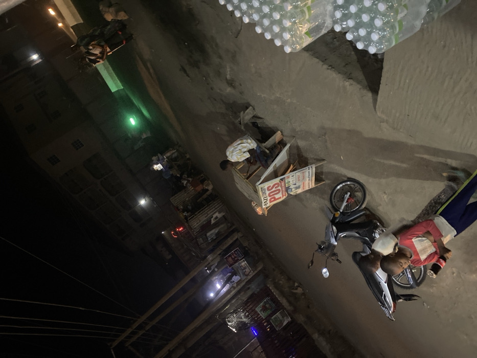 A nighttime street scene features a child lying on the ground next to a motorcycle. The child wears a pink shirt and blue pants. A small POS kiosk stands nearby, attended by a person in a white shirt. Bottles of water are piled against a wall. Buildings line the street, illuminated by various lights. The composition is angled, giving a tilted perspective.