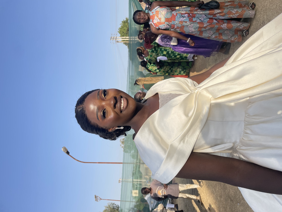 This image captures an outdoor daytime scene in Jos, Nigeria, featuring a woman prominently in the foreground amidst a gathering. The main subject, a dark-skinned woman in her late twenties to early thirties, occupies the center-right of the frame, smiling directly at the camera. She wears a cream-colored satin gown with a structured, cowl-neck style bodice over a sheer, polka-dotted undershirt. Her dark hair is styled in an updo, and she wears drop earrings. In the mid-ground on the left, a young Black male stands with hands on his hips, wearing a grey t-shirt with a graphic and light-colored trousers, looking towards the right. Further to the right, another Black woman in a multi-patterned, halter-neck jumpsuit holds a black handbag, looking left. Behind these figures, several individuals, mostly women, are visible. A group of women on the right are dressed in traditional Nigerian attire, primarily green patterned fabrics. One woman wears a purple dress. The individuals appear to be standing, observing, or mingling. The environment consists of an unpaved, dirt ground. A light green mesh fence or netting, consistent with a sports court boundary or event barrier, stretches across the mid-background. Above this, a tall, dark-colored street light pole with a single luminaire is visible on the left, under a clear, bright blue sky. Another utility pole or structure is present on the far right, with distant trees and sparse vegetation also visible.