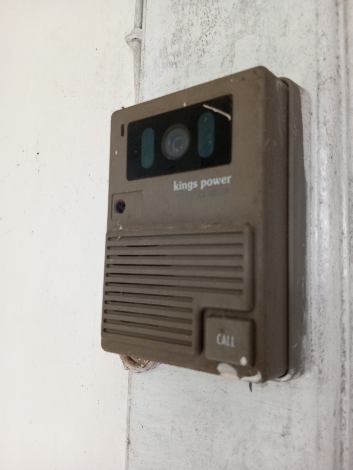 A weathered, rectangular "kings power" intercom system is mounted on a white, possibly plaster wall