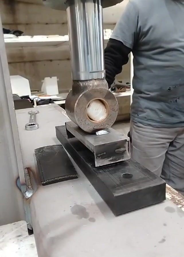 A man is operating a hydraulic press in a workshop setting. The press is positioned above a workbench that includes several pieces of metal work. A round metal part is clamped by the press, bearing down onto a smaller metal structure on the workbench. The man is wearing a grey shirt and pants, with dark sleeves visible underneath. He stands to the right of the press, presumably controlling its operation. The workbench and surrounding areas show signs of welding and metal fabrication. The workshop contains tools and materials on shelves in the background.