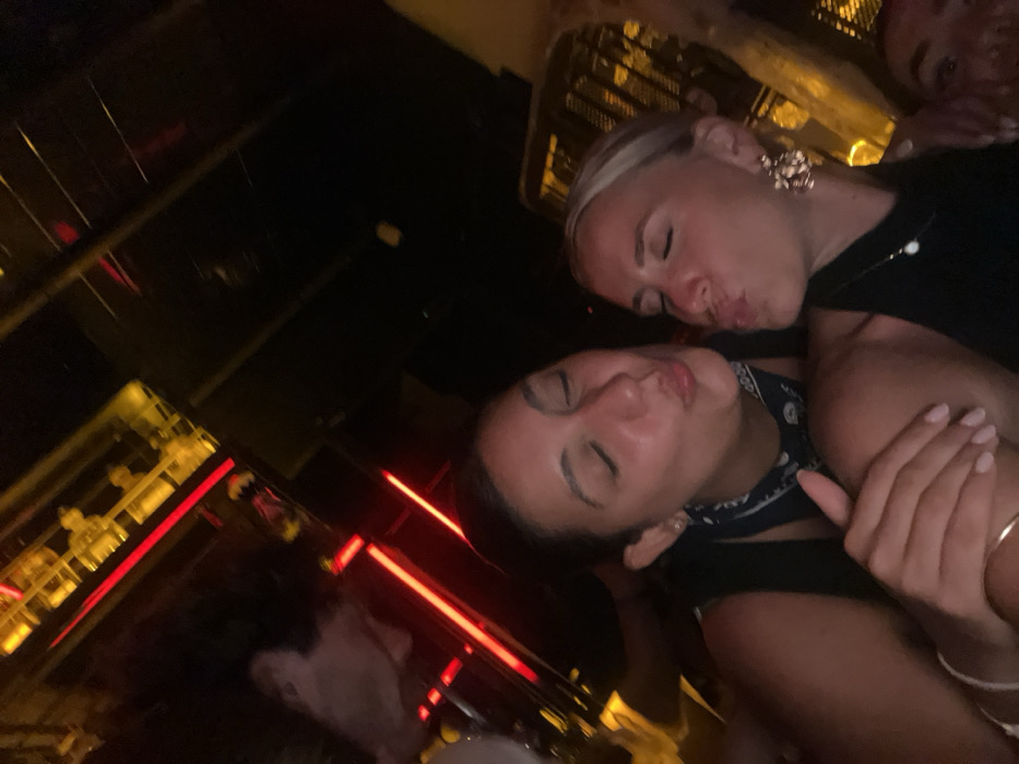 The image depicts a nighttime indoor scene within a nightclub or bar in Uluwatu, Indonesia, characterized by dim ambient lighting and strong artificial illumination. Two adult females occupy the central foreground, posing with their eyes closed and lips puckered in a "kissing" gesture. The woman on the left has dark hair pulled back and wears a dark sleeveless top with a dark, patterned bandana around her neck. Her right hand rests on the left arm of the woman to her right. This second woman has blonde hair, wears a dark sleeveless top, a delicate necklace with a white pendant, and a prominent, intricate gold-toned earring on her right ear. The background is dark, featuring multiple light sources. Two distinct parallel red neon-like strips are visible diagonally on the mid-left. Above and to the right, various structures, possibly part of a bar or decorative elements, are illuminated with warm yellow-orange light, appearing somewhat blurred. In the upper-left quadrant, a blurry figure of a person is partially visible. A fourth individual's face is partially visible, blurred, in the lower-right corner of the frame. The overall composition is a tilted, close-up shot capturing a social interaction.